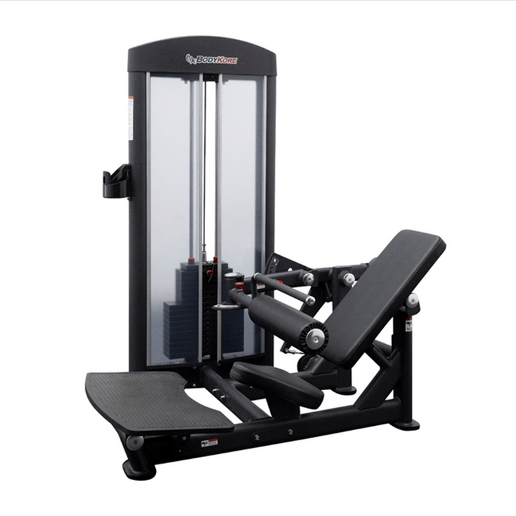 The BodyKore Selectorized hip thrust is a commercial glute building machine. The pivoting back pad allows the user to thrust their hips upwards and contract their glutes. The BodyKore hip thrust has a swinging lever arm that allows the user to easily get in and out of the seat. The stack weight is easily accessible from the seated position so the user can increase/decrease weights conveniently between reps. The machine comes with a 220lb weight stack that is upgradeable to 340lbs.